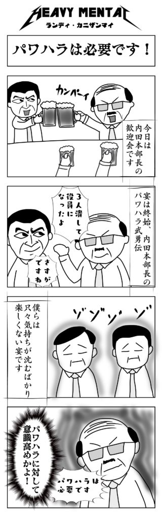 世間のパワハラ騒動。そんなのを見ていてもキット「はぁ?このぐらいで何騒いでんだ?」ぐらいの感覚なのでしょう。会社の運営にはパワハラが必要!パワハラで会社は動いていますと確信している彼ら。飲み会の席ではお酒が入りパワハラ宣言しちゃったりします。